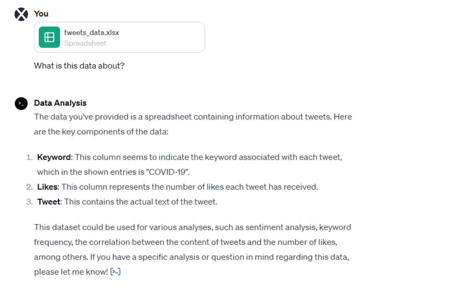We still have a lot of tweets, but we will do more sifting together. First of all, we will use the Data Analysis plugin provided by ChatGPT-4 for the whole process. We first send the data we keep as an excel file to the Data Analysis plugin and ask our first question; “What is this data about?”