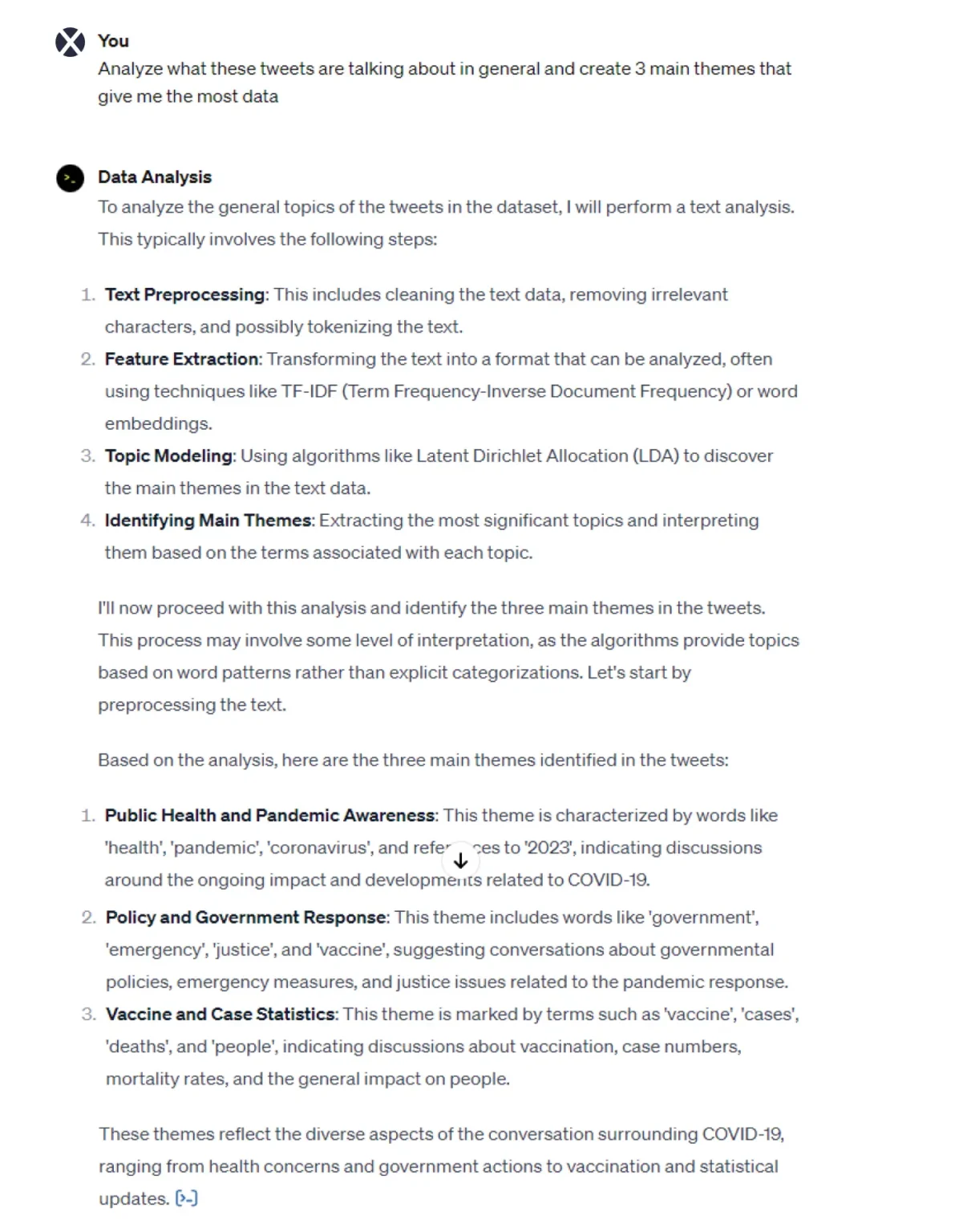 Now we tell Data Analysis to delete the data with the keyword Vaccine from the dataset. After eliminating the data with the Vaccine keyword, 5001 tweets remain. These commands are very easy for ChatGPT’s data analysis capabilities. It’s time to make things a little more difficult.