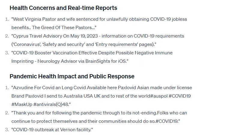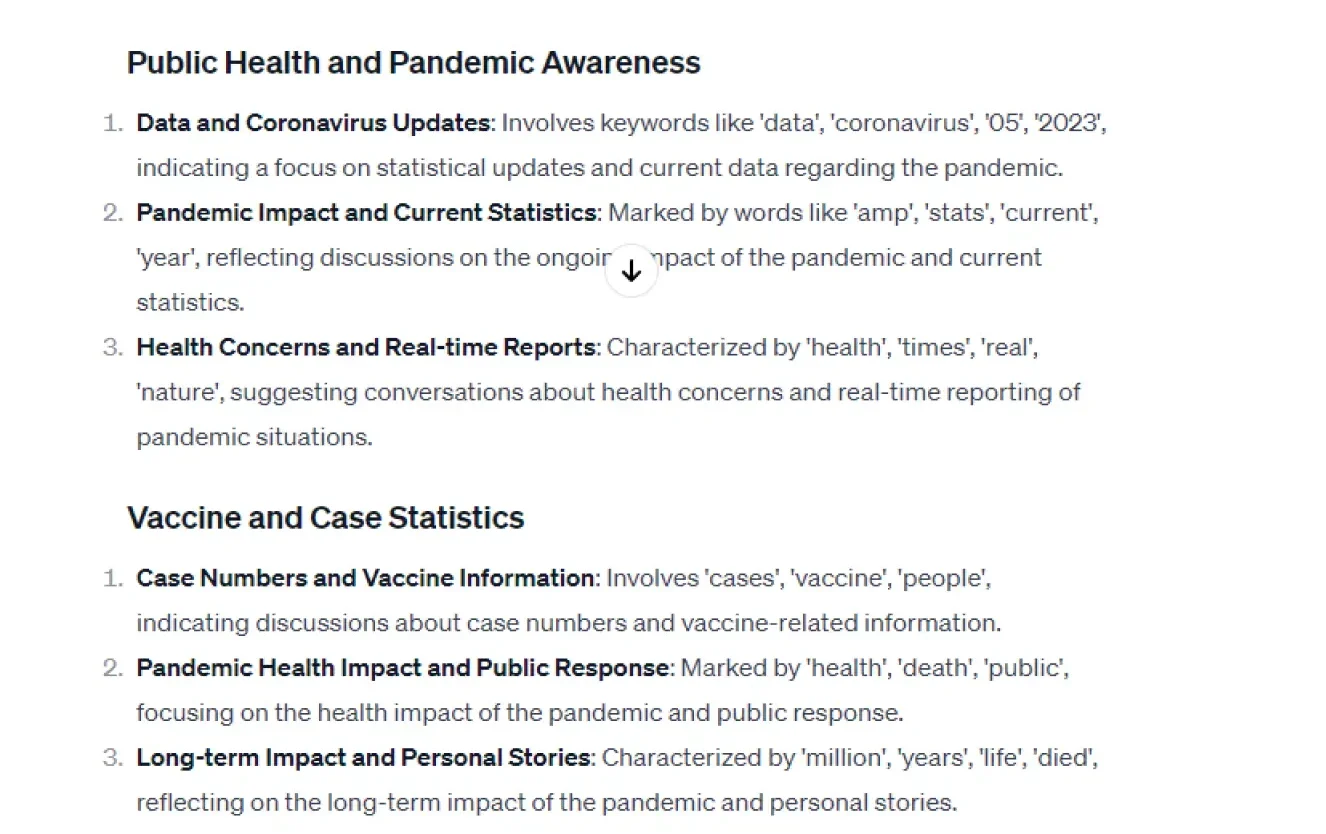 ChatGPT gave us a summary of what this dataset contains. We then asked it which keywords were in the dataset and got the correct answer. If you remember, we limited our dataset to the keywords COVID-19 and Vaccine.