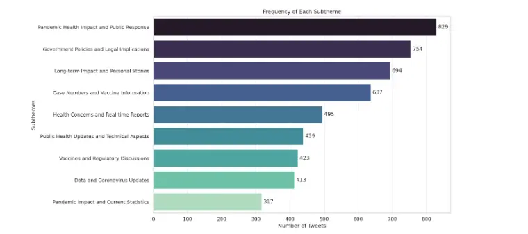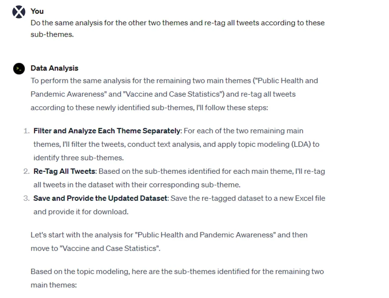 Once we have identified our main themes, the next thing we need to do is to identify the sub-themes under these main themes. For this, we first told ChatGPT something like “Taking the data labeled with “Policy and Government Response” from these themes, we need to create 3 sub-themes where these data meet in common.” When it did this perfectly, we asked it to do the same analysis for the other two themes and create sub-themes.